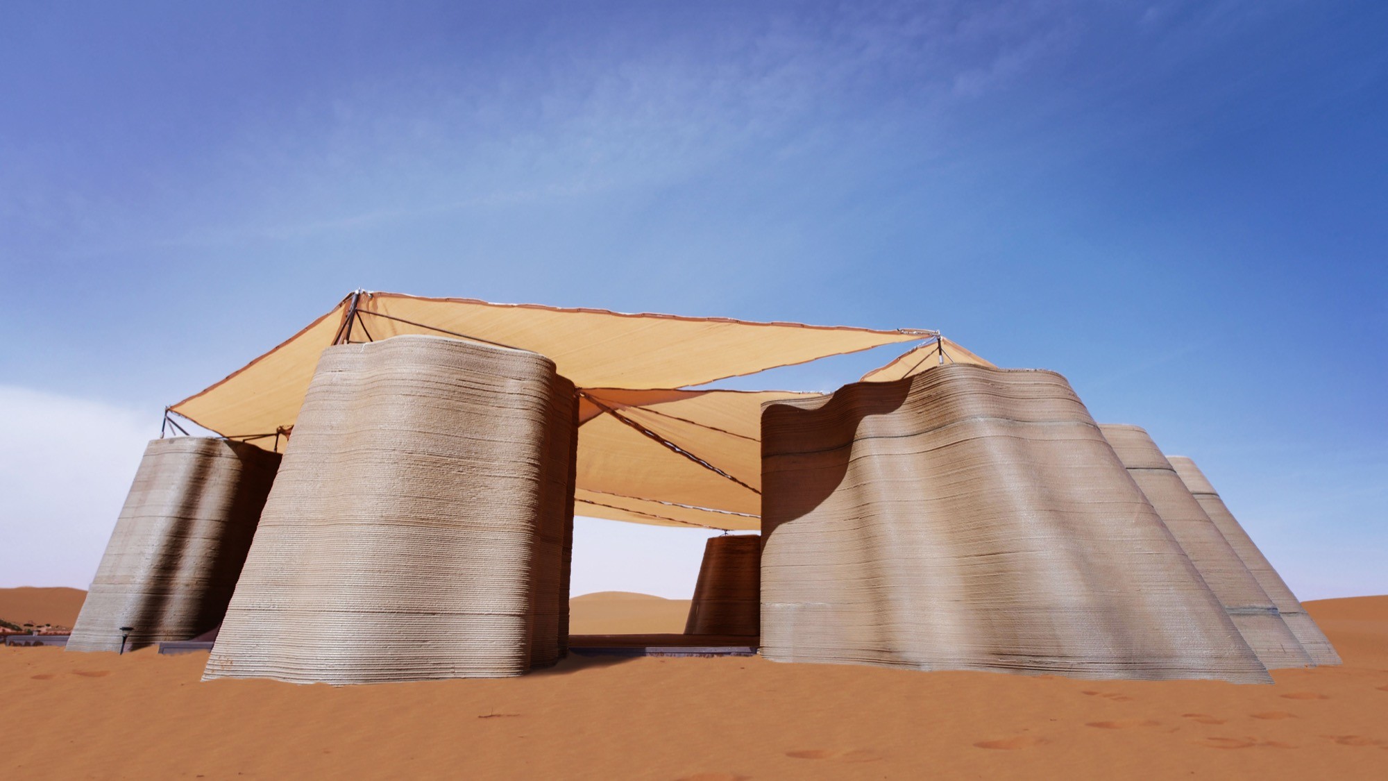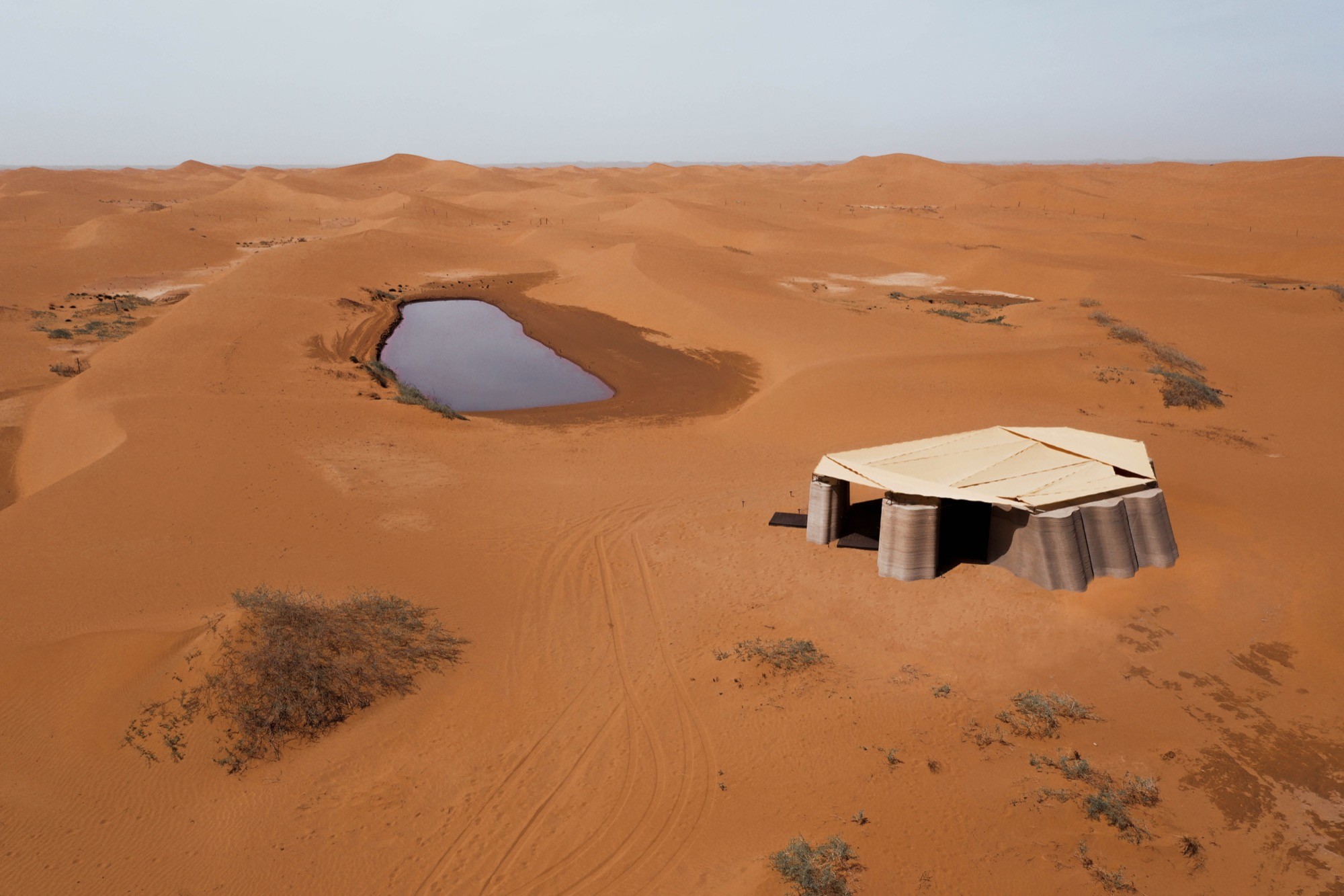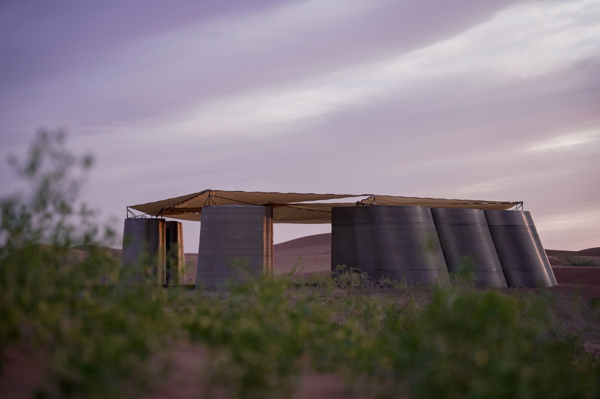 The undulating form of each unit mimics desert dunes, reducing wind load and blending into the topography. The 3D-printed concrete mix uses recycled desert sand, aligning construction with its environment. Each unit rests directly on the sand, stabilized by its own mass. Timber floors are raised on reused cargo pallets connected by steel pipes, allowing the cluster to be dismantled and relocated as the afforestation program expands.