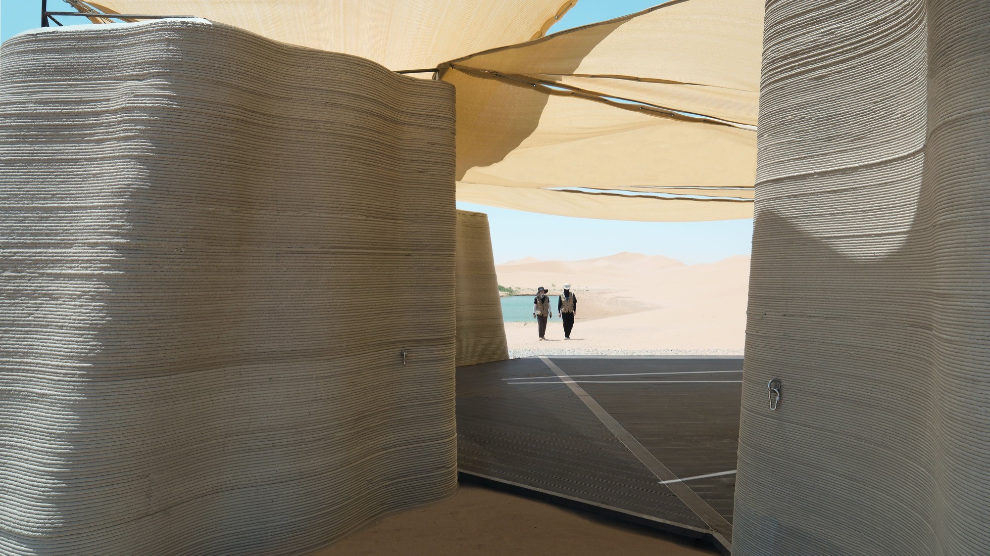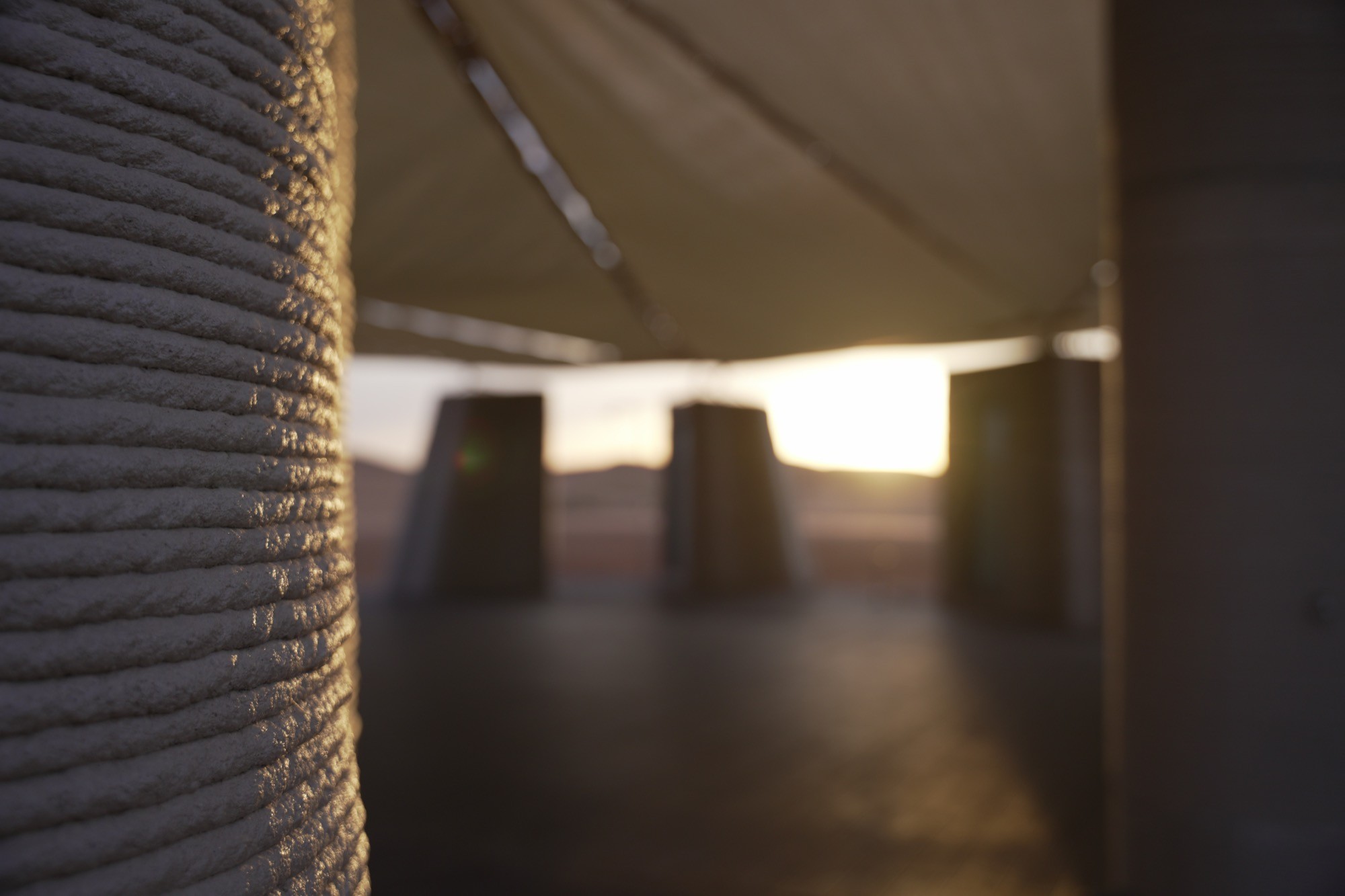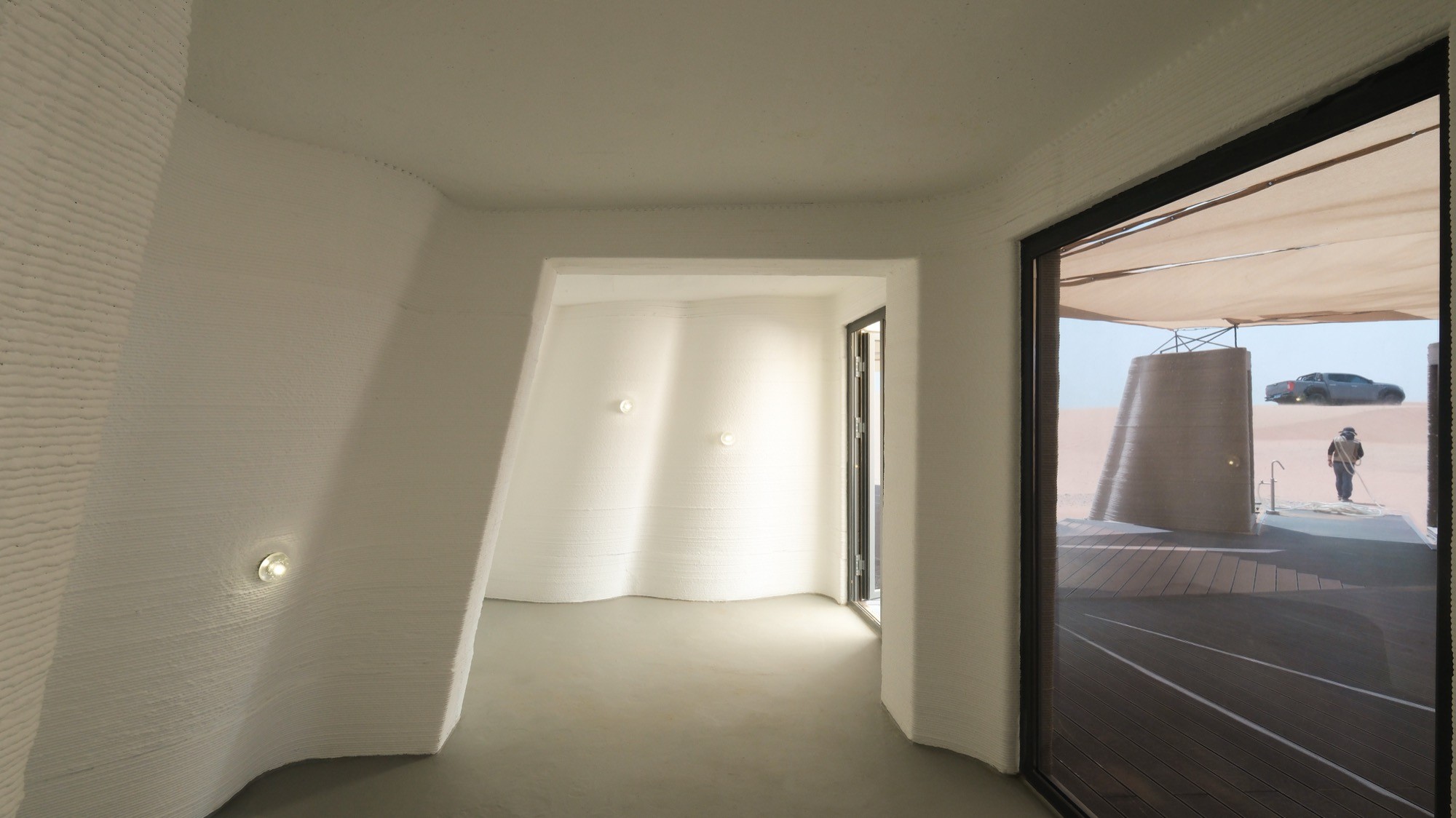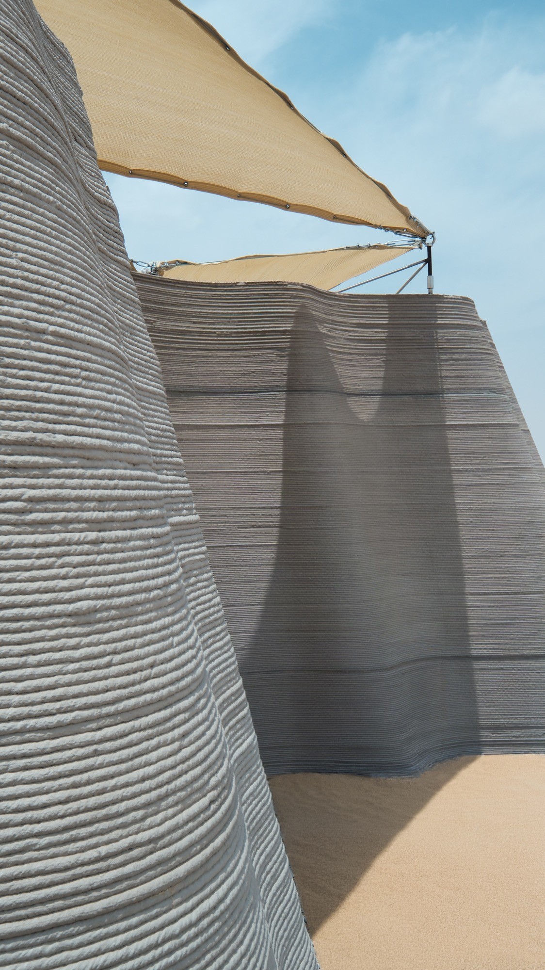The undulating form of each unit mimics desert dunes, reducing wind load and blending into the topography. The 3D-printed concrete mix uses recycled desert sand, aligning construction with its environment. Each unit rests directly on the sand, stabilized by its own mass. Timber floors are raised on reused cargo pallets connected by steel pipes, allowing the cluster to be dismantled and relocated as the afforestation program expands.
