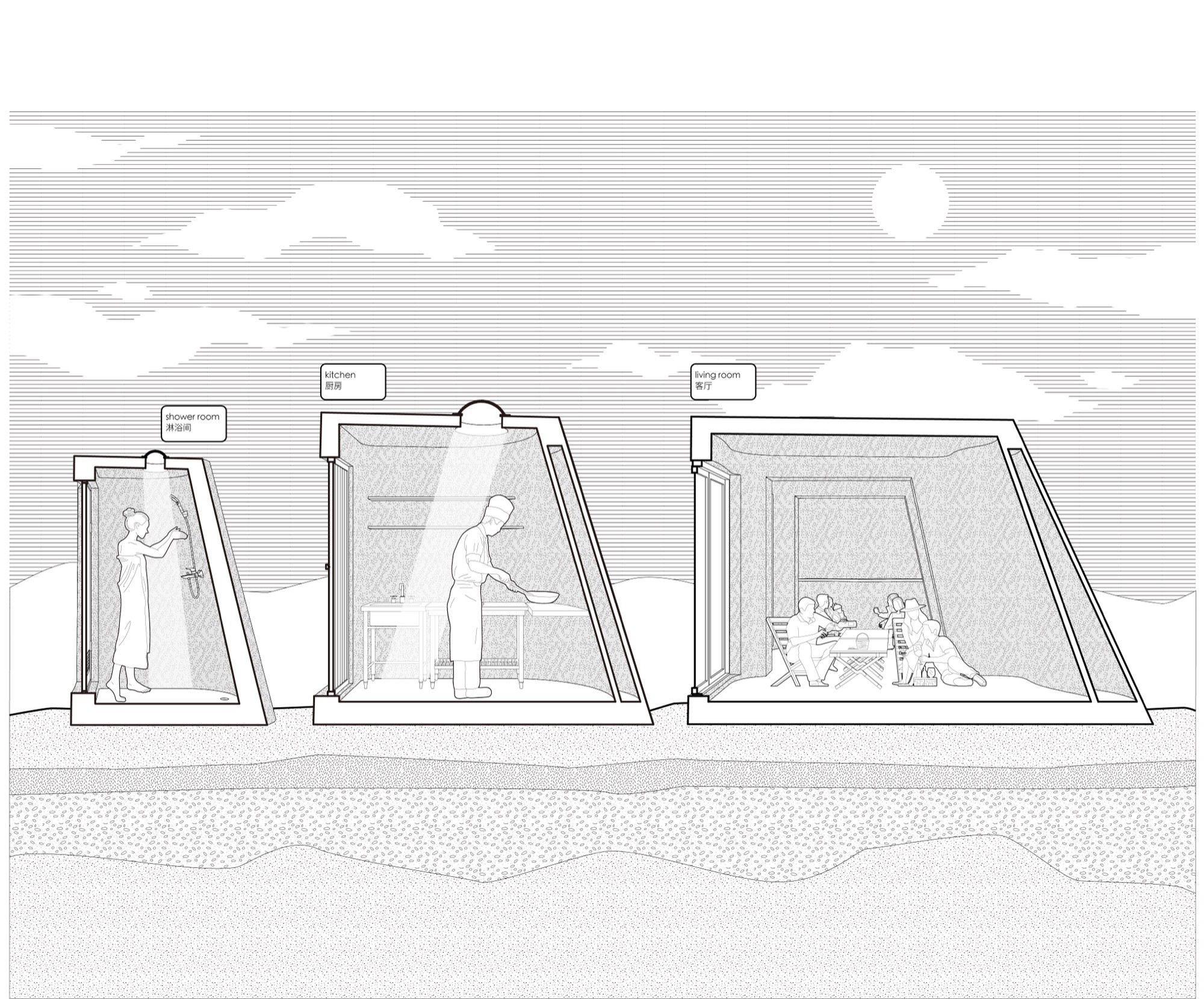 Initiated by the non-profit organization Planting Trust, the project is located in Alxa Left Banner, Inner Mongolia, where winds reach 34 meters per second, daytime temperatures rise to 45°C, and nights plunge below -30°C. Working with limited funds and time, the team adopted 3D-printed concrete technology developed by Professor Xu Weiguo’s lab at Tsinghua University. The 150-square-meter compound is divided into nine modular units containing living, cooking, bathing, and storage spaces.