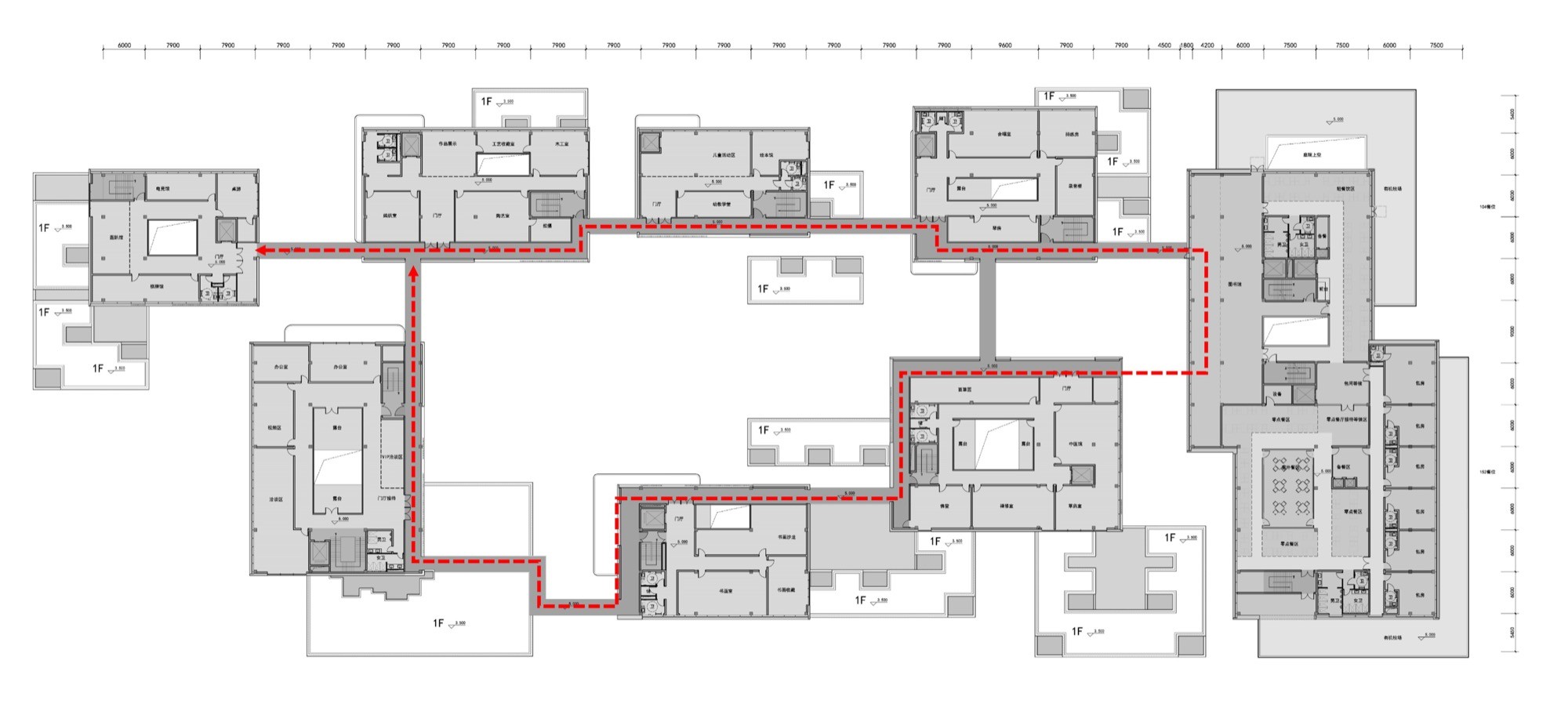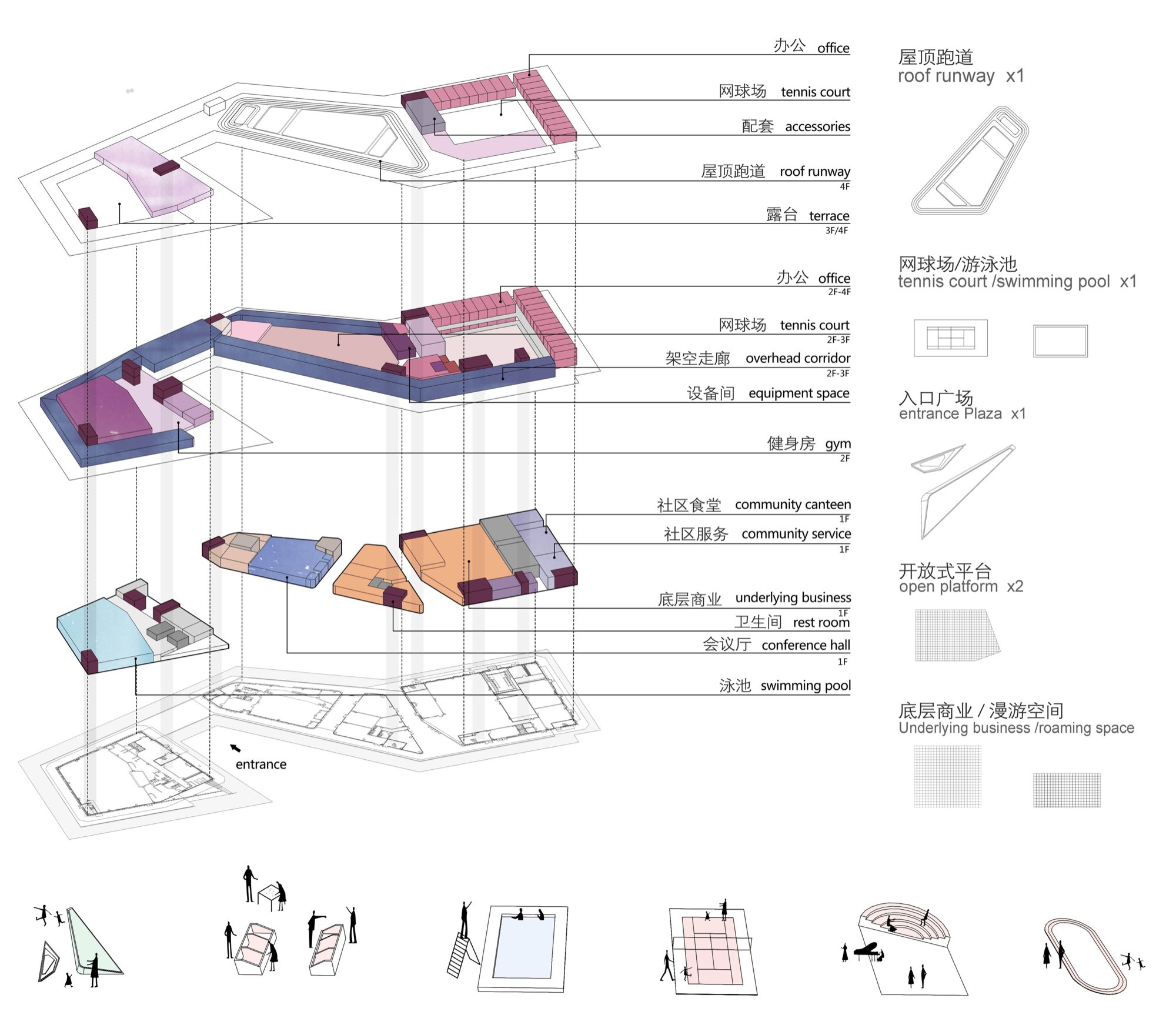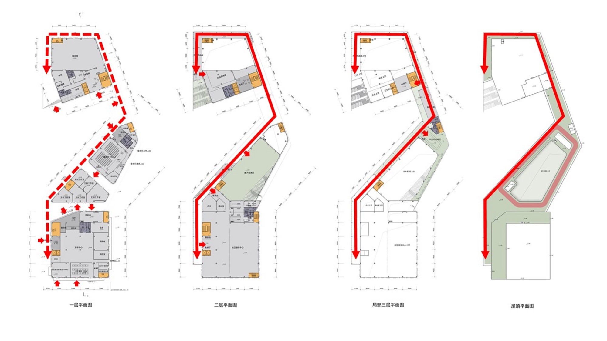 Three continuous loops bind the fragments: a rooftop running track and glass-walled activity ring in the entrance sports complex, an elevated interest loop threading the second-floor balconies of the village centre boxes, and a ground-level “hidden” covered walkway that slips under overhanging slabs and weaves through a cascade of staggered courtyards. These loops are not merely circulation; they are the primary social condensers, deliberately oversized and left programmatically vague so that they can be colonised by spontaneous occupation.