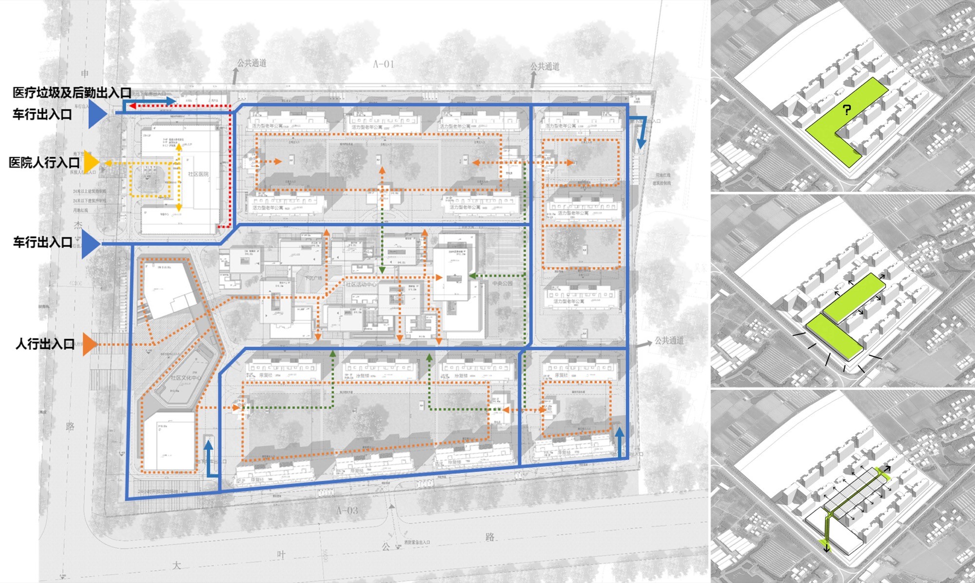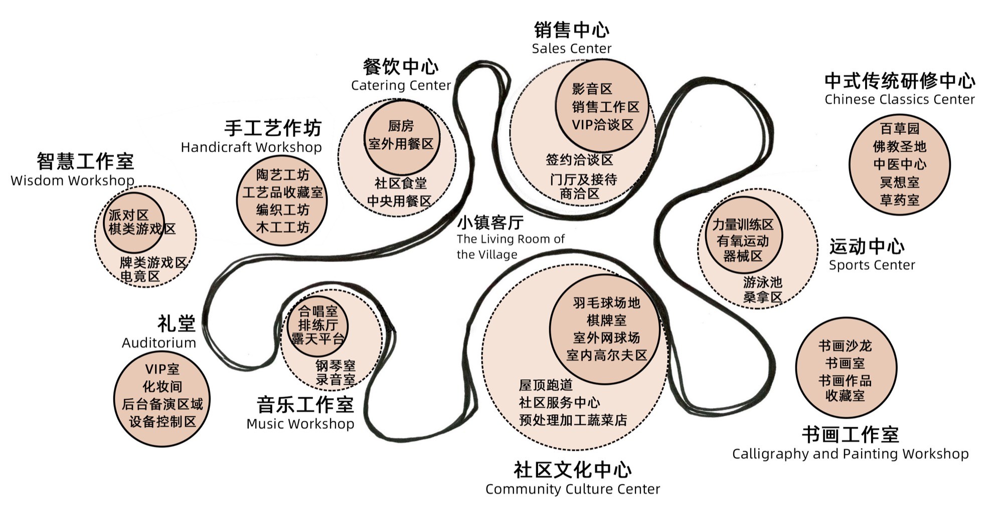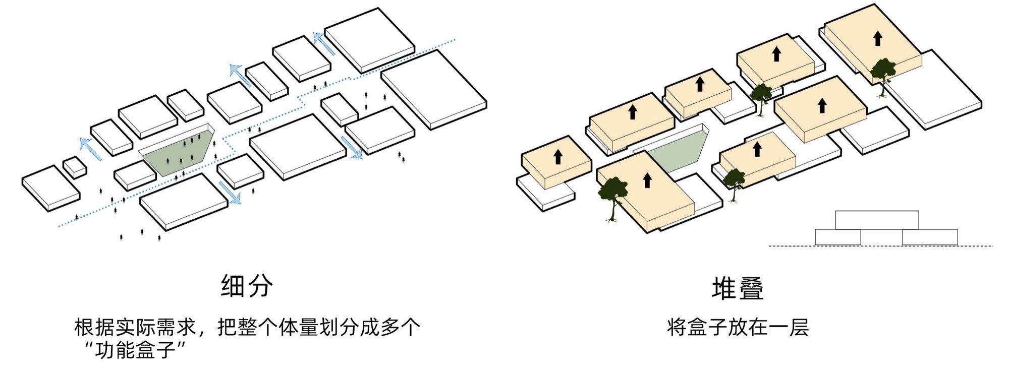 The site sits amid the classic Chinese urban-fringe patchwork of villages, irrigation canals and oversized roads. The masterplan turns this liability into an asset by positioning the entire complex as the missing centre of the wider territory. A horizontal T-shaped spine of public amenities stretches toward the main road while simultaneously plunging deep into the residential fabric, maximising both civic exposure and internal accessibility. Along this spine, 22 loosely stacked, displaced boxes form a porous “village centre” of cafés, clinics, workshops, galleries and performance spaces, each given its own address and independent volume so that it can evolve separately from the whole. Residential clusters are pulled apart into semi-autonomous neighbourhoods, shrinking the managed “private” realm and releasing the interstitial territory to public life.