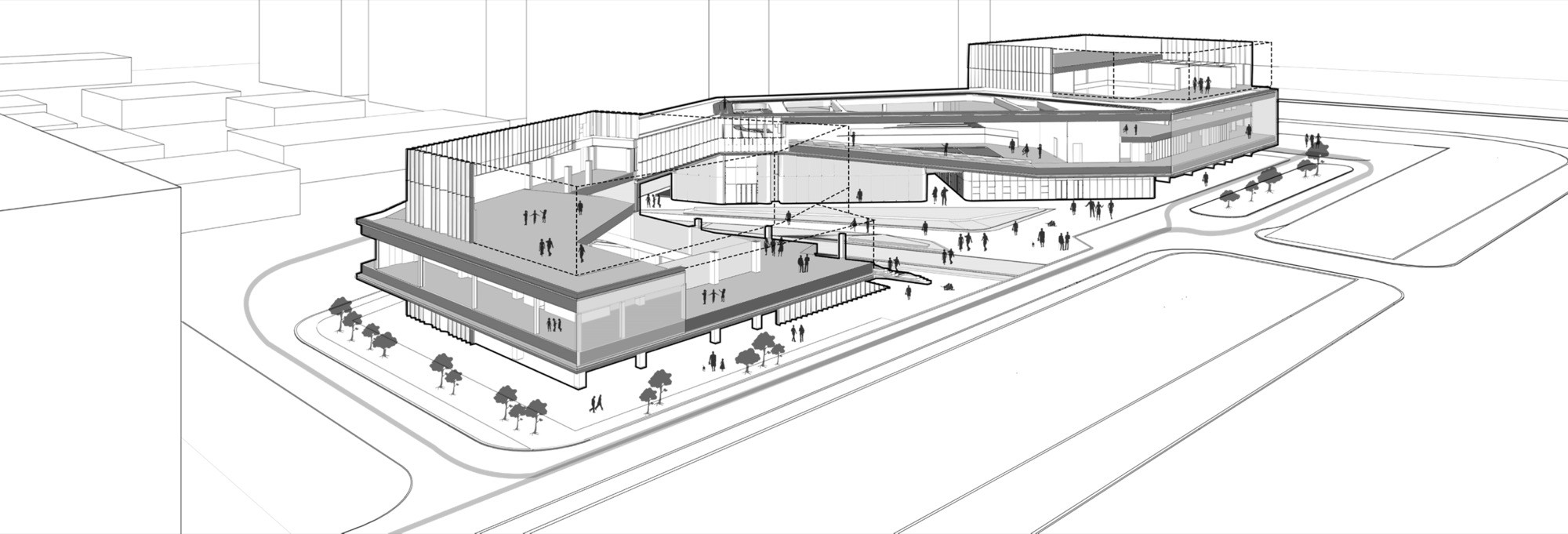 The architecture cultivates deliberate looseness. Courtyards overlap and interlock, generating unexpected leftover pockets: corner terraces, sky-lit passages, miniature amphitheatres discovered only after completion. Ground-floor studios and transparent glass pavilions are seeded as undefined incubators, already morphing into flower shops, artist residencies, children’s farms and pop-up exhibition spaces. Even the wide corridors of the sports complex have been claimed as aerial galleries and exercise circuits.